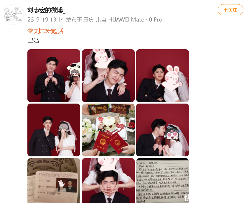 9月19日,退圈多年的前养成系刘志宏晓谕结婚,晒出和夫人的九宫格领证合照和亲笔信,向粉丝第一本领共享甘心。刘志宏和夫人头贴头看着镜头,目光当中齐是甜密。