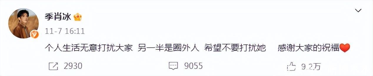 11月7日,季肖冰被拍到和一位女子逛街,女友孕肚彰着。之后他发承认隐婚当爸,并称:“个东说念主糊口意外惊扰巨匠,另一半是圈外东说念主,但愿不要惊扰她,感谢巨匠的道喜。季肖冰演过《封神英杰榜》里的伯邑考,还在《你是我的荣耀》饰演女主的前男友,天然在文娱圈莫得大火,关联词他得益了真爱,如今被拍到就火速承认,也算是很有担当了。