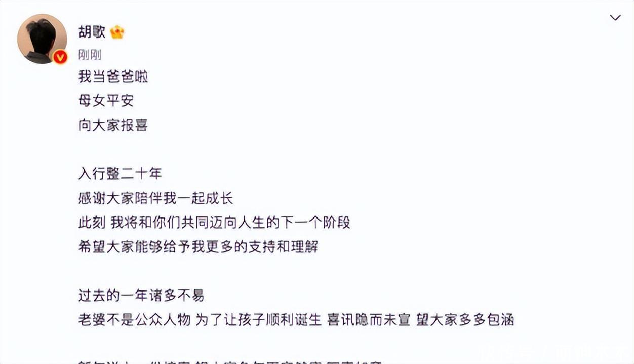 要说最惊喜和最快速的,当属胡歌官宣。他径直官宣结婚并升级作念爸爸,之后女方被扒出是黄曦宁,和胡歌在职责中日久生情。胡歌并未裸露妻子身份,官宣后把妻女保护得极度好。
